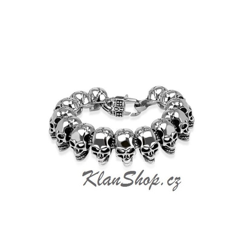 Náramek z chirurgické oceli, masivní náramek složený z lebek.