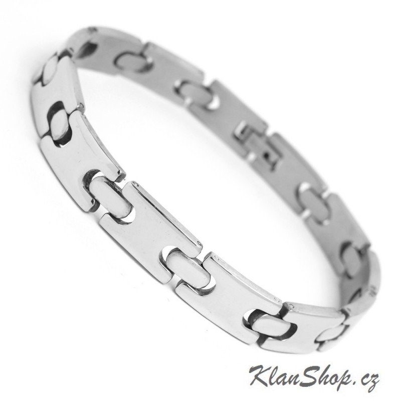 Náramek z chirurgické oceli, plochý náramek tvořený z plátků a lesklými spoji.