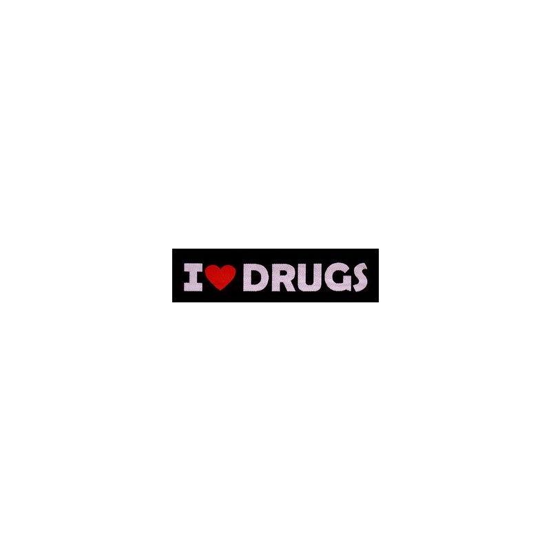 Podlouhlá nášivka na textil nebo kůži I Love Drugs.