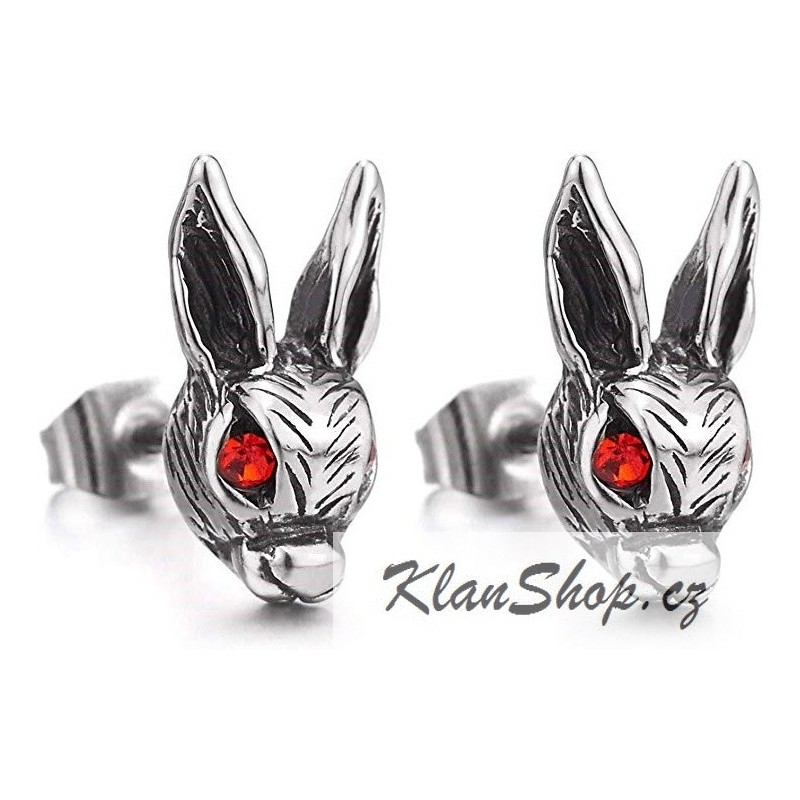 Ocelové náušnice (náušnice z chirurgické oceli) - malé zaječí hlavy s červenými kamínky v očích.