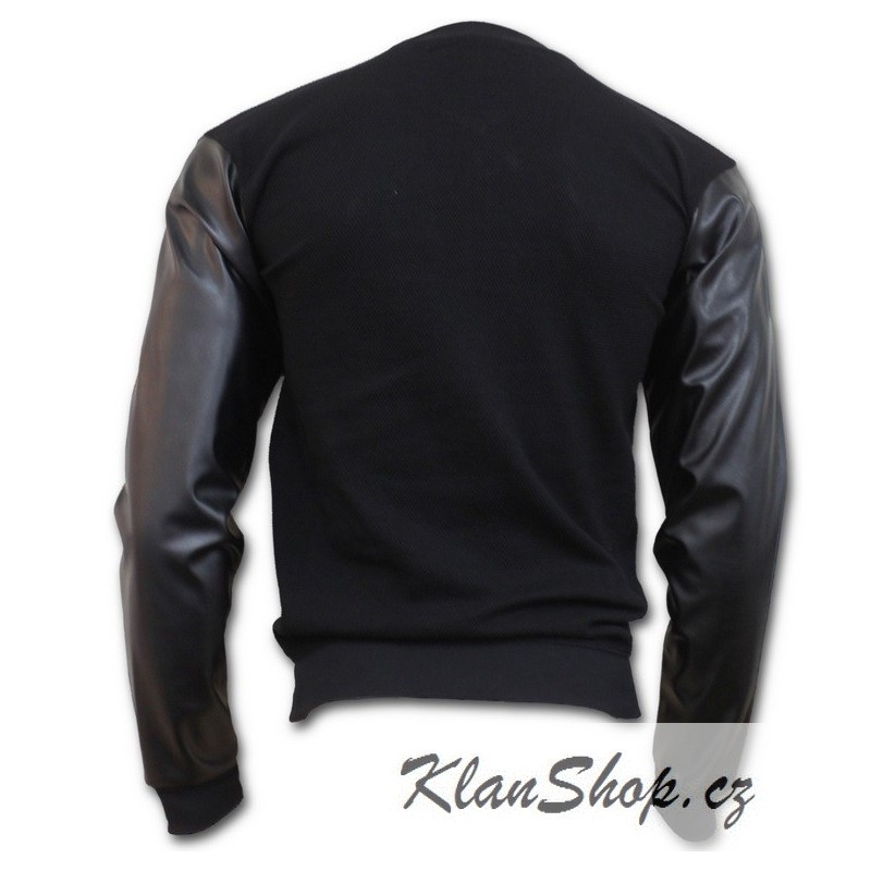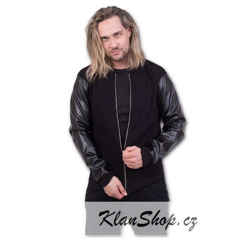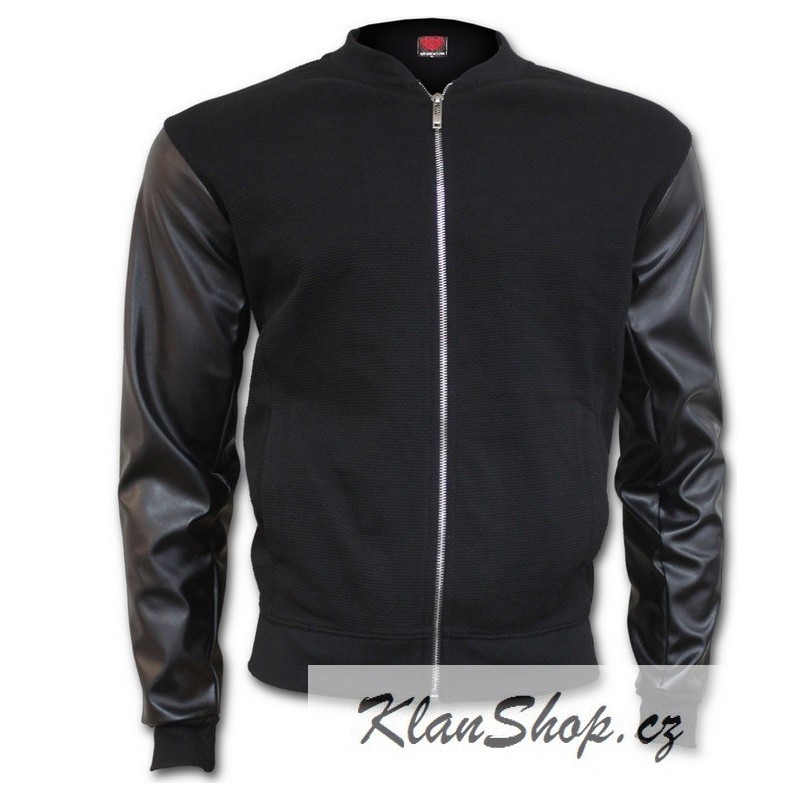 Pánská černá bunda ve stylu bomberu s lesklými rukávy, bez kapuci na zip.