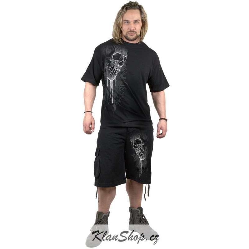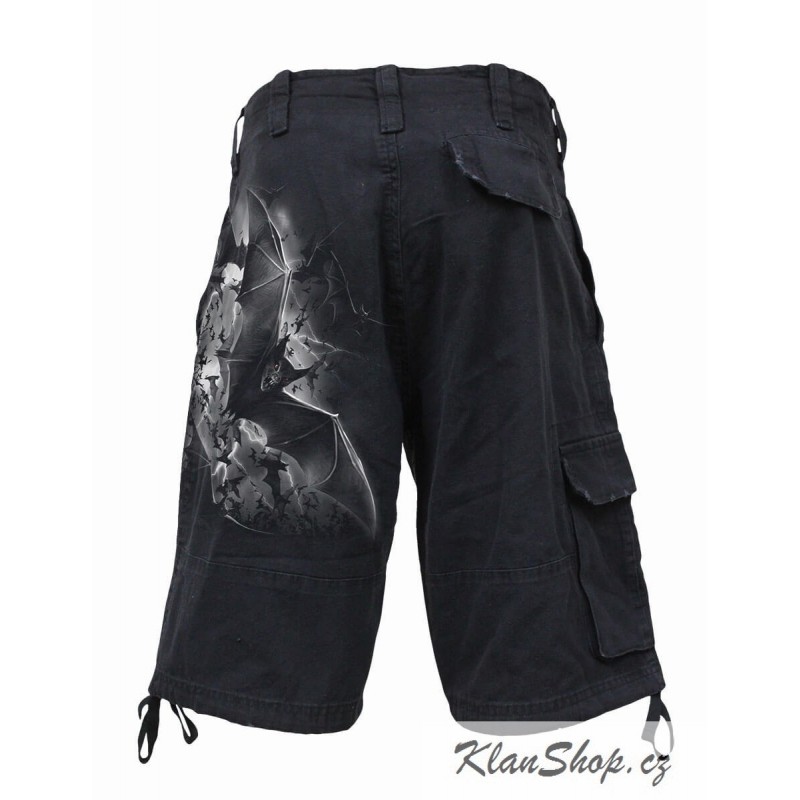 Pánské kraťasy s potiskem, černé s kapsou, roztékající se lebka, netopýři.