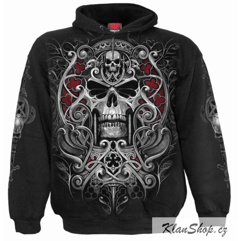 Pánská černá mikina bez zipu s kapucou a potiskem - lebka s gotickými prvky, kostlivec v kápi, kostlivci s andělskými křídly.
