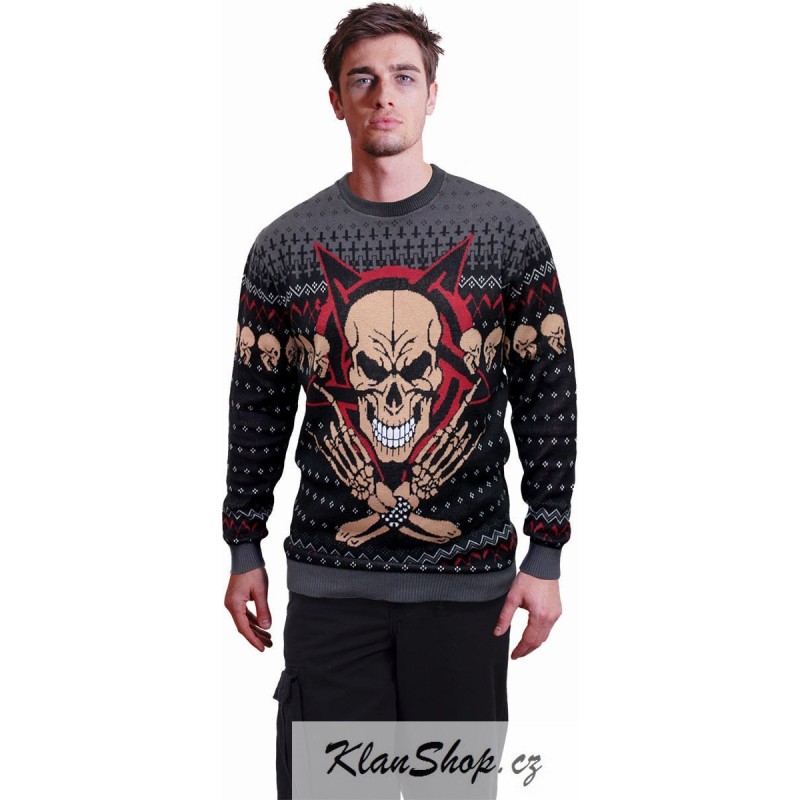 Pánský pletený svetr Spiral Direct - Satanská lebka s paroháčema, malé lebky, kosy a kříže.
