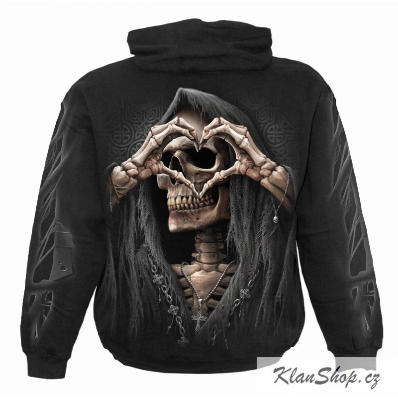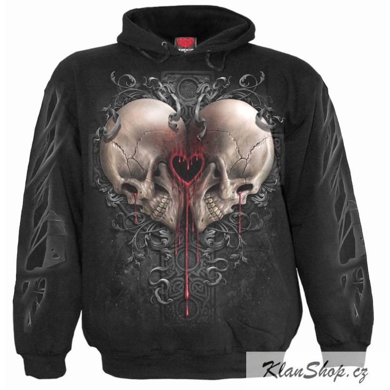 Pánská černá mikina bez zipu s kapucou a potiskem - lebky s krvácejícím srdcem, smrtka ukazující srdce.