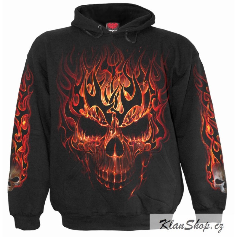 Pánská černá mikina bez zipu s kapucou a potiskem - tribal lebka s plameny, hořící rozdrcená lebka.