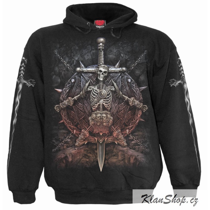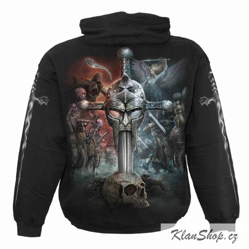 Pánská černá mikina bez zipu s kapucou a potiskem - přivázaná kostra krále, boj mezi dobrem a zelm, apokalypsa.