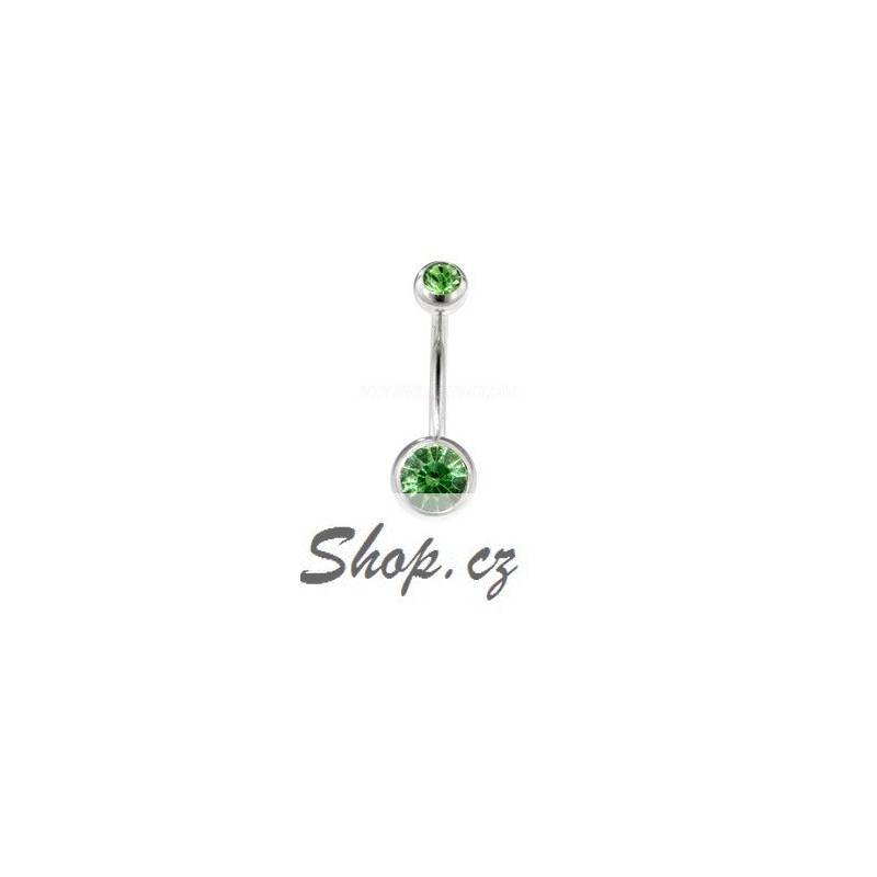 Piercing z chirurgické oceli vhodný do pupíku - tyčka ve tvaru banánku, světle zelené kamínky na obou koncích.