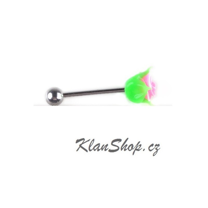 Piercing z chirurgické oceli vhodný do jazyka - tyčka s kuličkou zakončená růžovou růží ze silikonu.