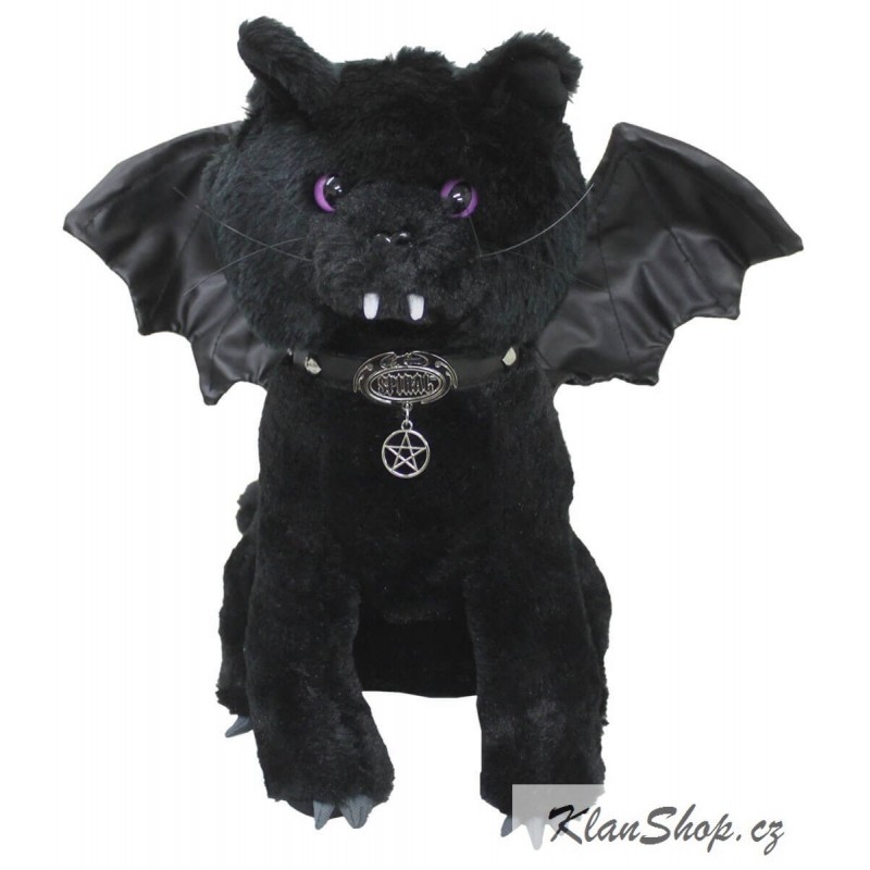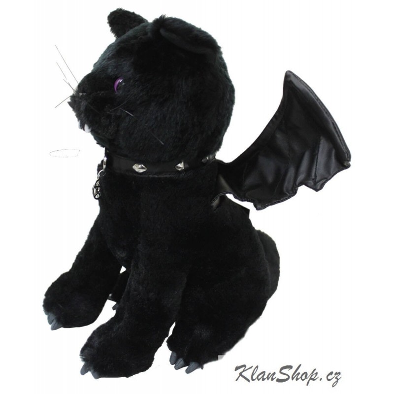 Plyšová hračka - černá fialovooká kočka s netopýřími křídly.