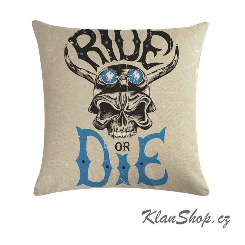Povlak na polštář s potiskem z jedné strany - Ride or die - lebka s helmou a rohy.