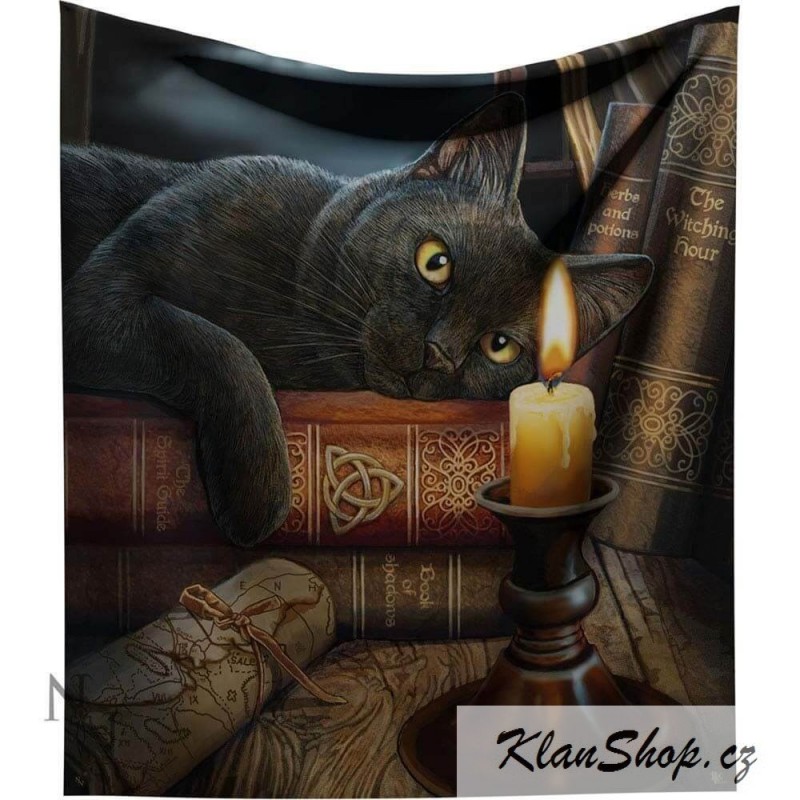 Přehoz - fleecová deka - černá kočka s hořící svíčkou na lexikoně kouzel.