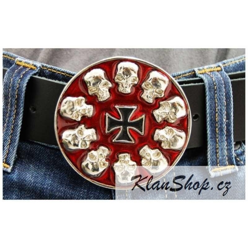 Přezka na opasek (pásek) s motivem - lebky v červeném oválu s maltézským černým křížem.