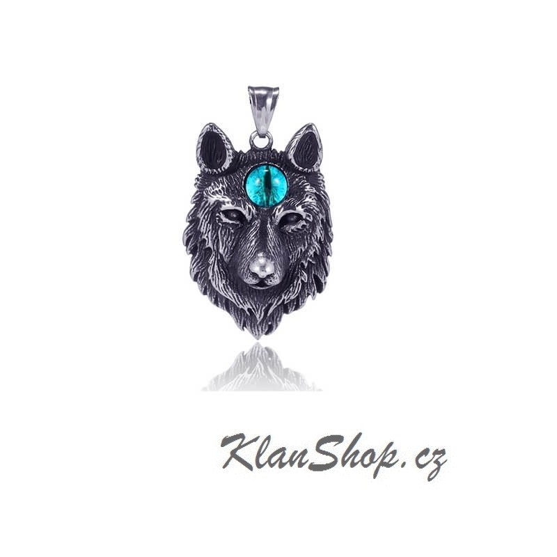 Přívěsek z chirurgické oceli, lesklá úprava - vlk s modrým okem na čele.