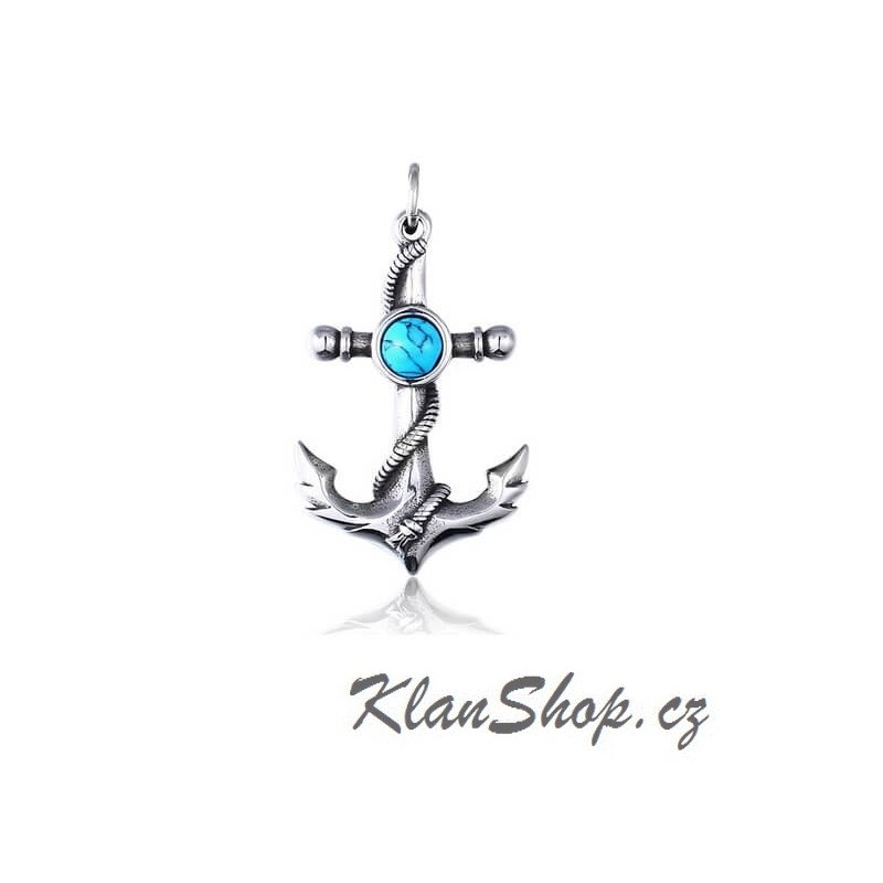Přívěsek z chirurgické oceli, lesklá úprava - kotva s modrým kamínkem.