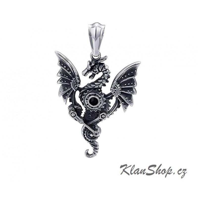 Přívěsek z chirurgické oceli, lesklá úprava - steampunk drak.