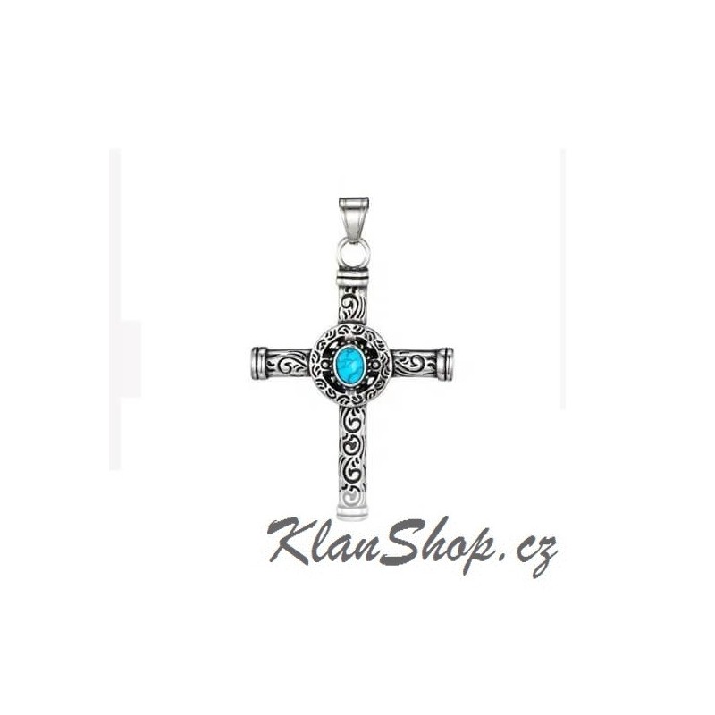 Přívěsek z chirurgické oceli, lesklá úprava - kříž s modrým kamínkem a ornamenty.