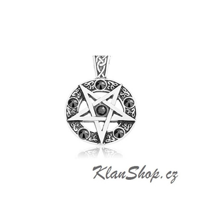 Přívěsek z chirurgické oceli, lesklá úprava - Pentagram s černými kamínky (zirkony).