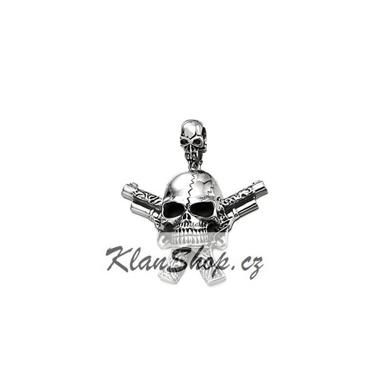 Přívěsek z chirurgické oceli, lesklá úprava - lebka s pistolemi.