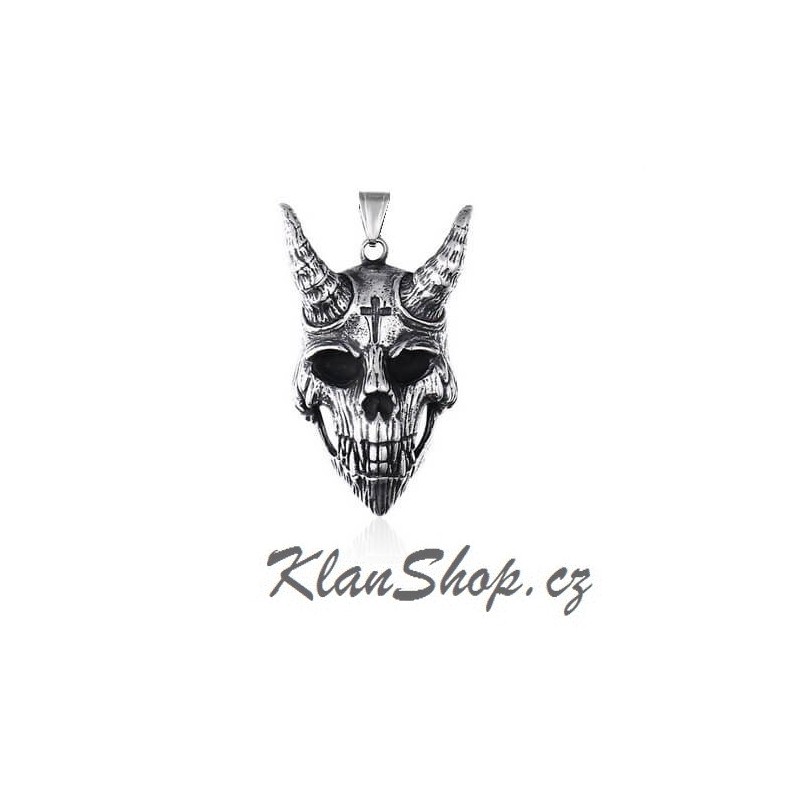 Přívěsek z chirurgické oceli, lesklá úprava - lebka s křížem s rohy, ďáblova lebka.