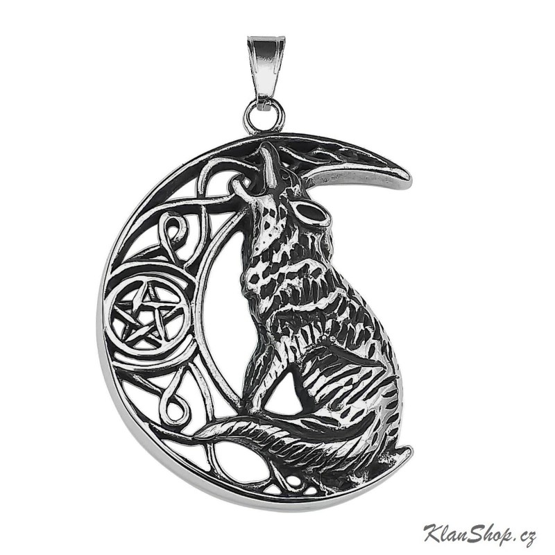 Přívěsek z chirurgické oceli, lesklá úprava - vyjící vlk v půlměsíci s pentagramem.