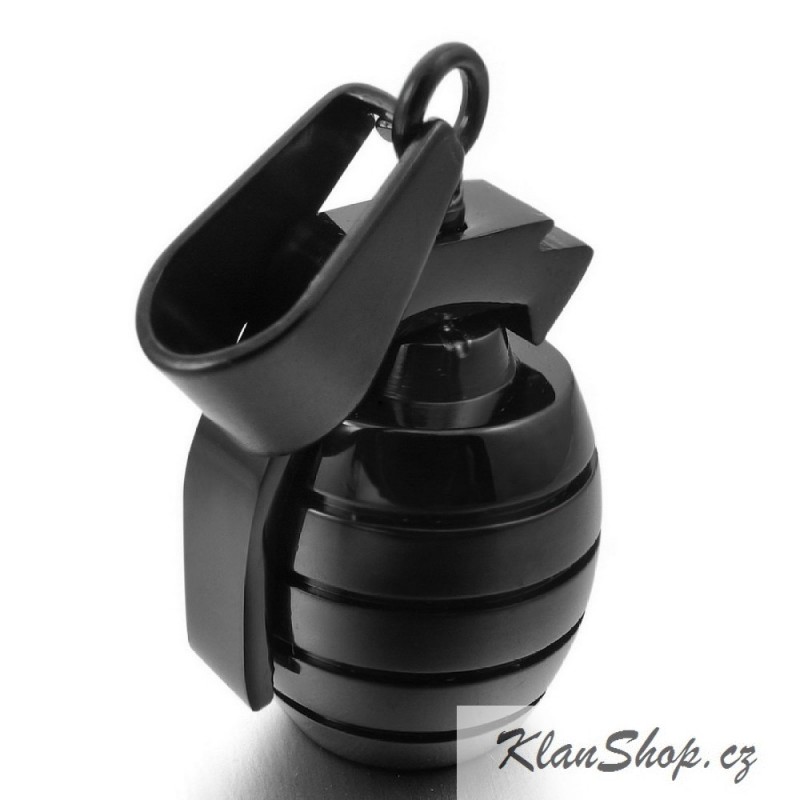 Přívěsek z chirurgické oceli 316L, malý černý armádní granát s pojistkou.