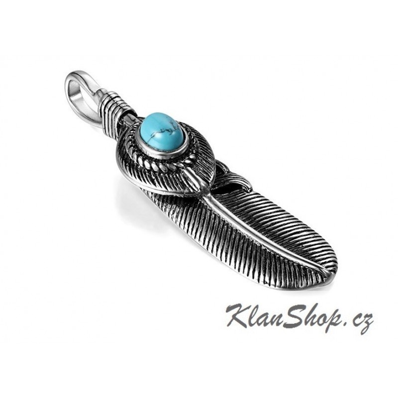 Přívěsek z chirurgické oceli 316L, pírko s modrým kamínkem.