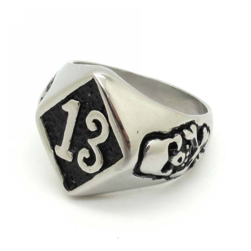 Prsten z chirurgické oceli, třináctka (13) s lebkami na stranách.