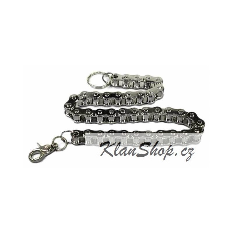 Motorový řetěz stříbrné barvy ke kalhotům, vhodný i pro připnutí peněženky, zavírání na karabinku.