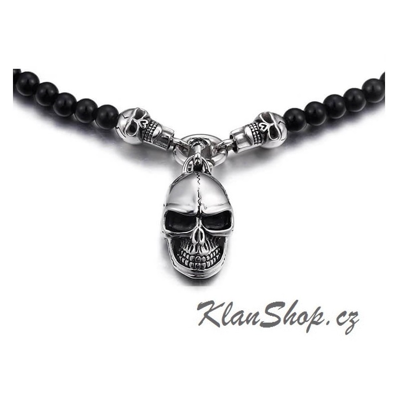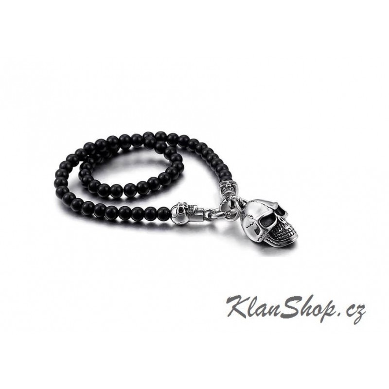 Řetízek z černých korálků a chirurgické oceli s přívěskem - lebka.