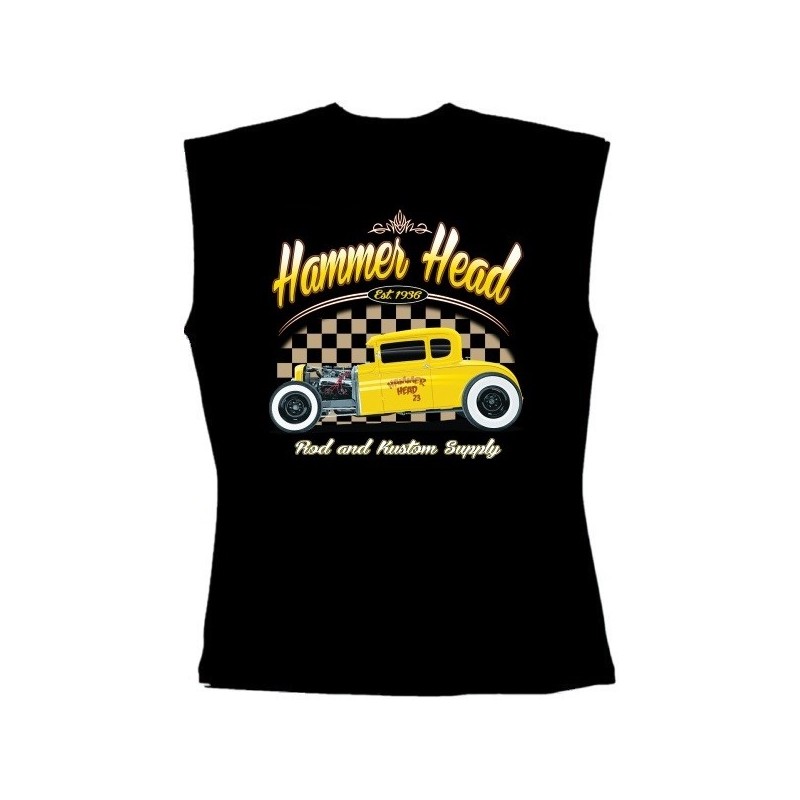 Pánské tričko bez rukávů s potiskem, hot rod hammer head, žlutý hot rod se šachovnicí.