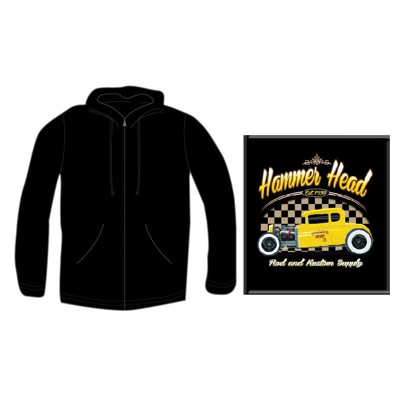 Pánská černá mikina se zipem a potiskem, žluté hot rod auto se šachovnicí.
