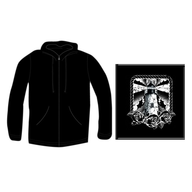 Pánská černá mikina se zipem a potiskem, černobílý maják s růžemi.