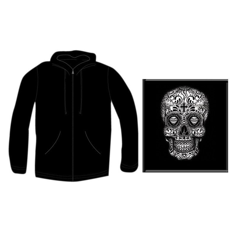 Pánská černá mikina se zipem a potiskem, černobílá lebka.