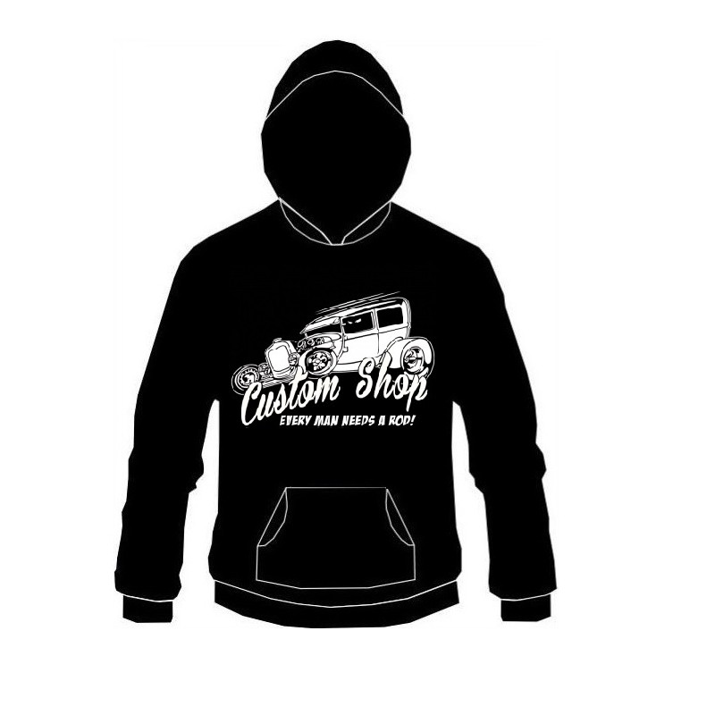 Pánská černá mikina s kapucí, bez zipu s potiskem, retro custom auto.