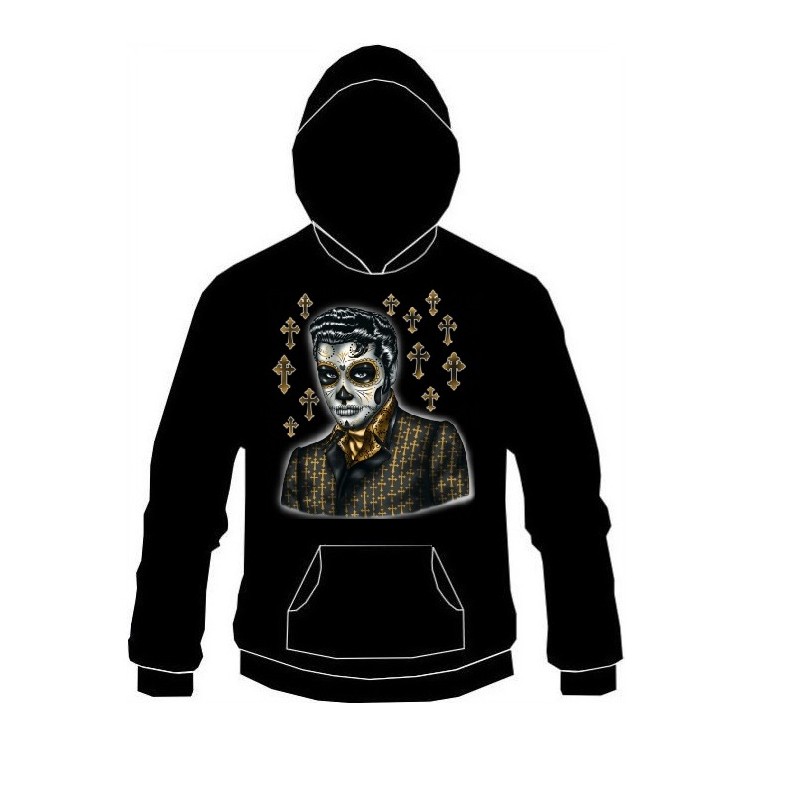 Pánská černá mikina s kapucí, bez zipu s potiskem, muertos Elvis se zlatými křížemi.