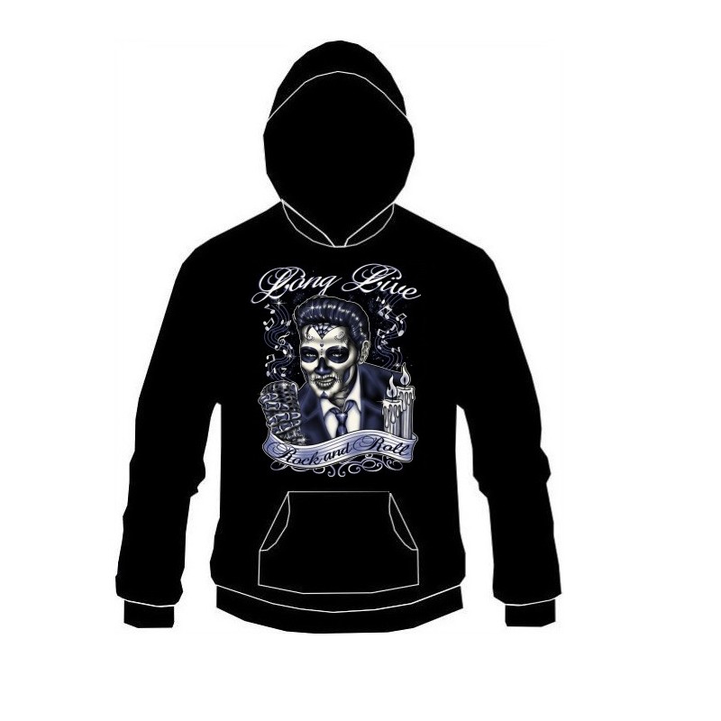 Pánská černá mikina s kapucí, bez zipu s potiskem, retro motiv Elvis, muertos.