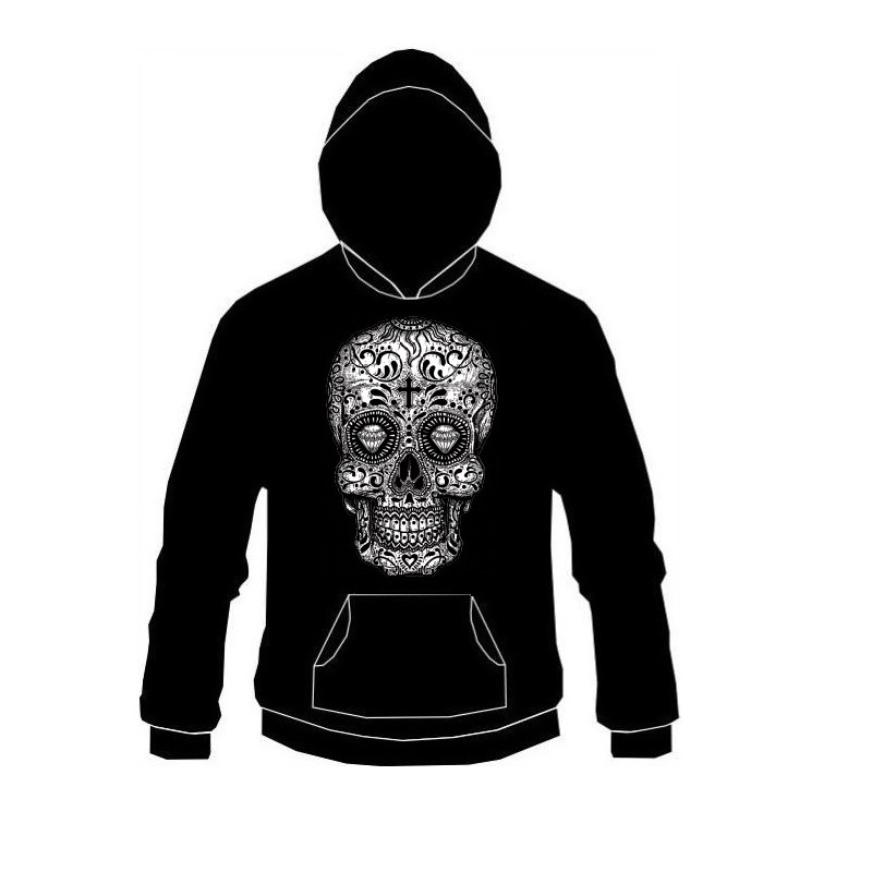 Pánská černá mikina s kapucí, bez zipu s potiskem, černobílá muertos lebka.