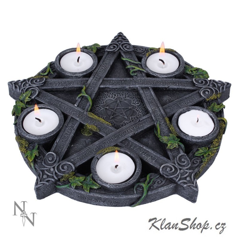 Dekorační svícen (stojan na svíčky) - pentagram s břečťanovými lístky a ornamenty.
