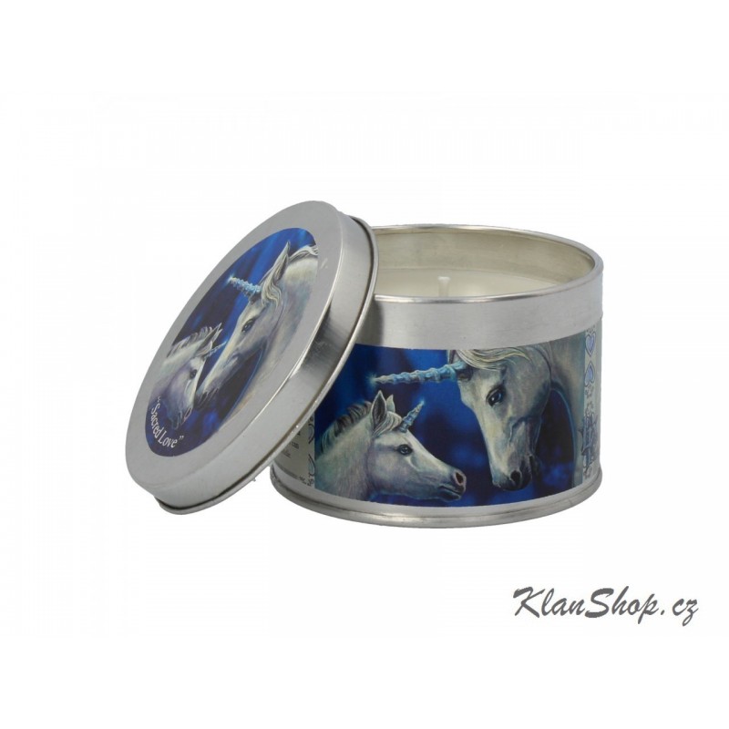 Dokrační vonná svíčka v plechové dóze - dva jednorožci - jasmínový čaj.