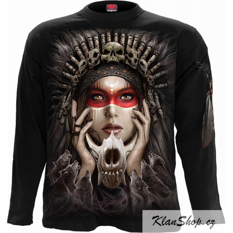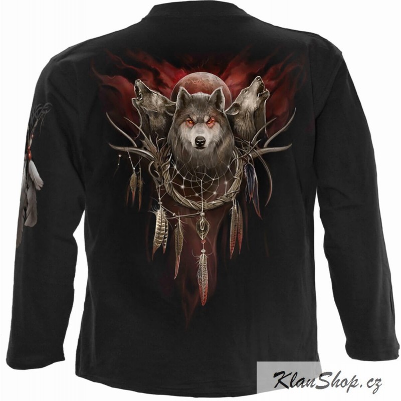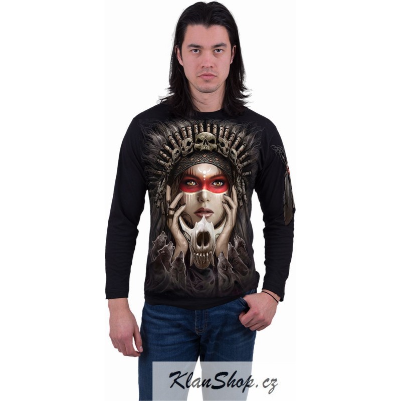 Pánské černé tričko s dlouhým rukávem s potiskem, holka s apačskou čelenkou z lebek, vyjící vlci, vlci v lapači snů.