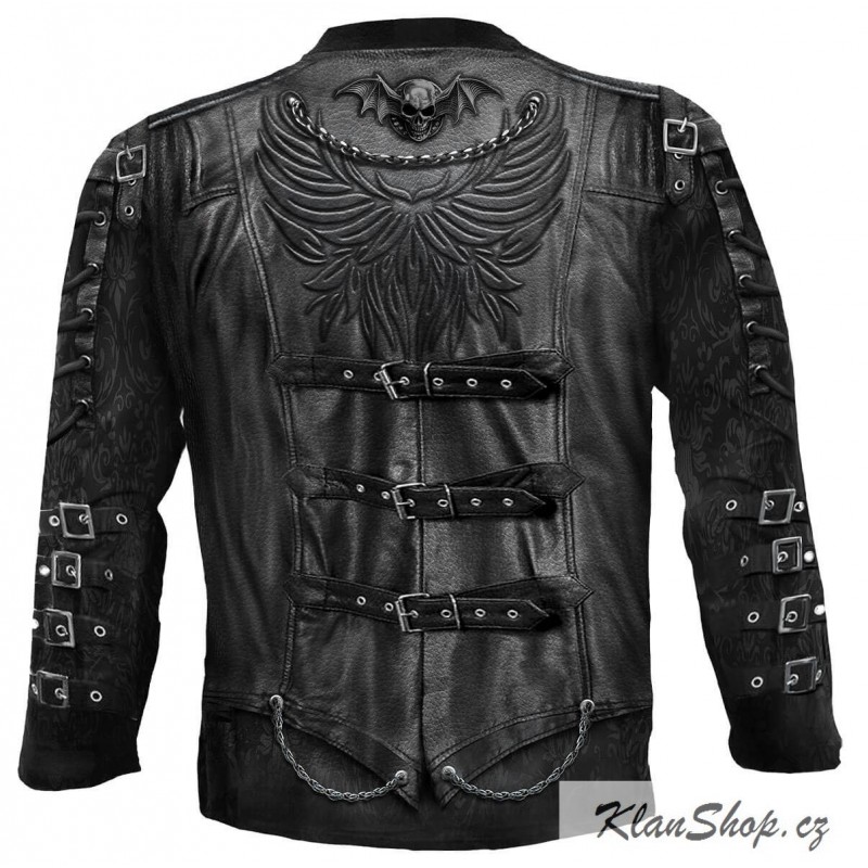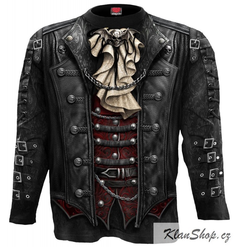 Pánské černé tričko s dlouhým rukávem s potiskem, gotická kožená vesta s přezkami.