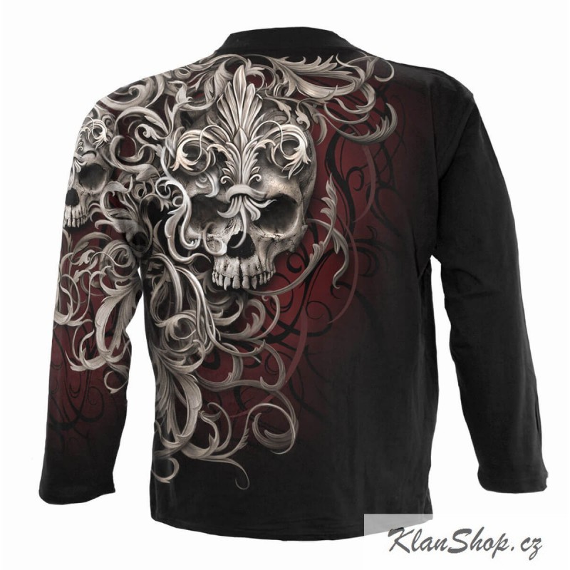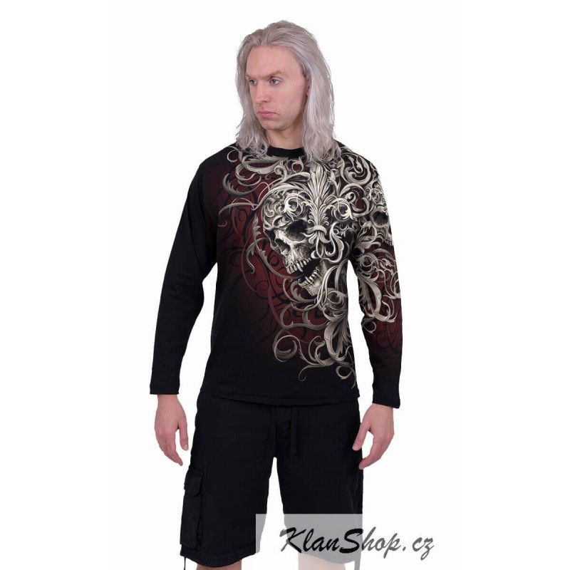 Pánské černé tričko s dlouhým rukávem s celopotiskem - lebka s ornamenty a pírky.