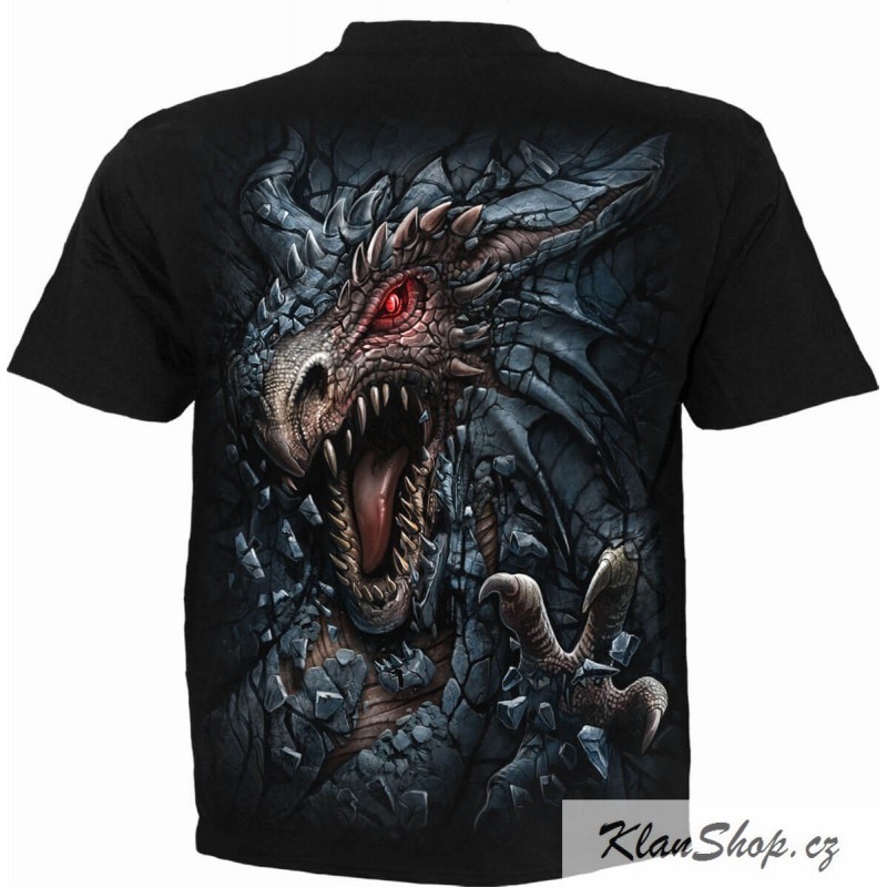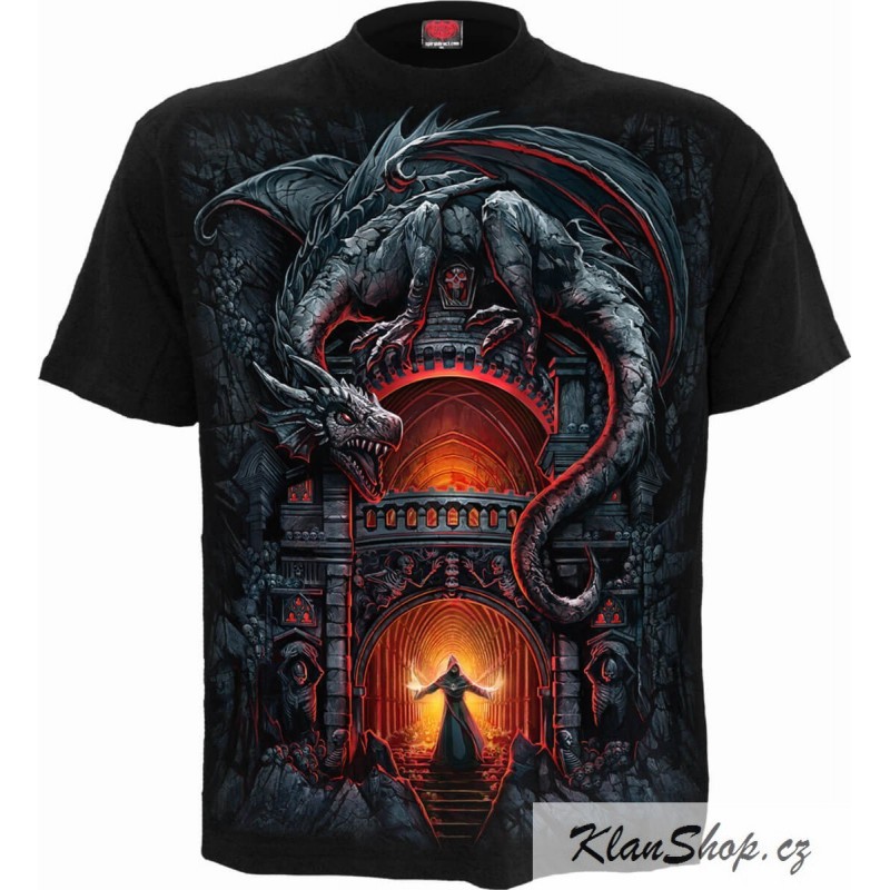 Pánské černé tričko s krátkým rukávem s potiskem - velký černý ostnatý drak s čarodějem v kobce, dračí doupě s kostlivcema.