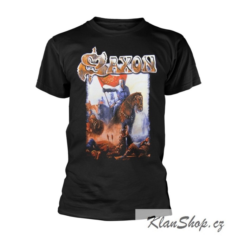Pánské černé tričko s krátkým rukávem a potiskem, Saxon Crusader.