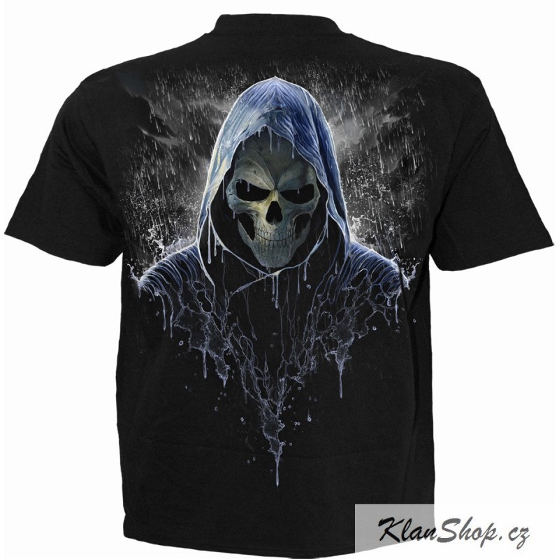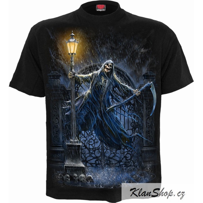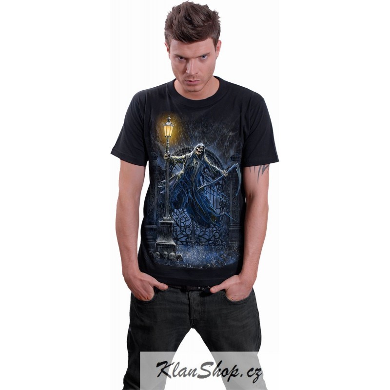 Pánské černé tričko s krátkým rukávem s potiskem - Kostlivec s kosou v dešti na pouliční lampě