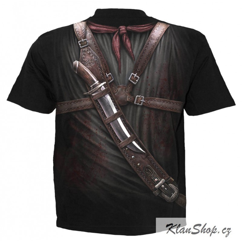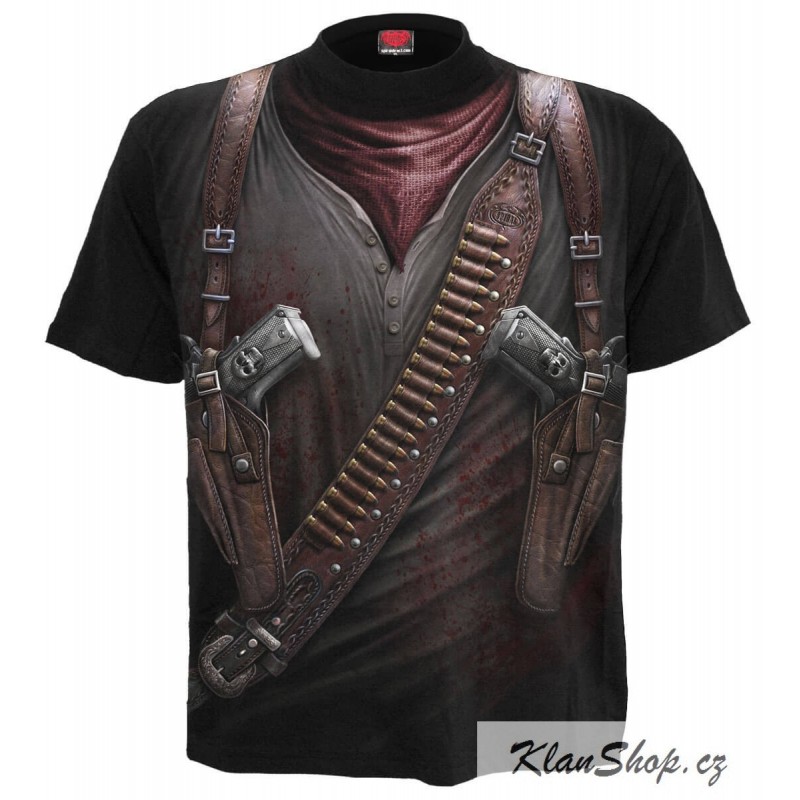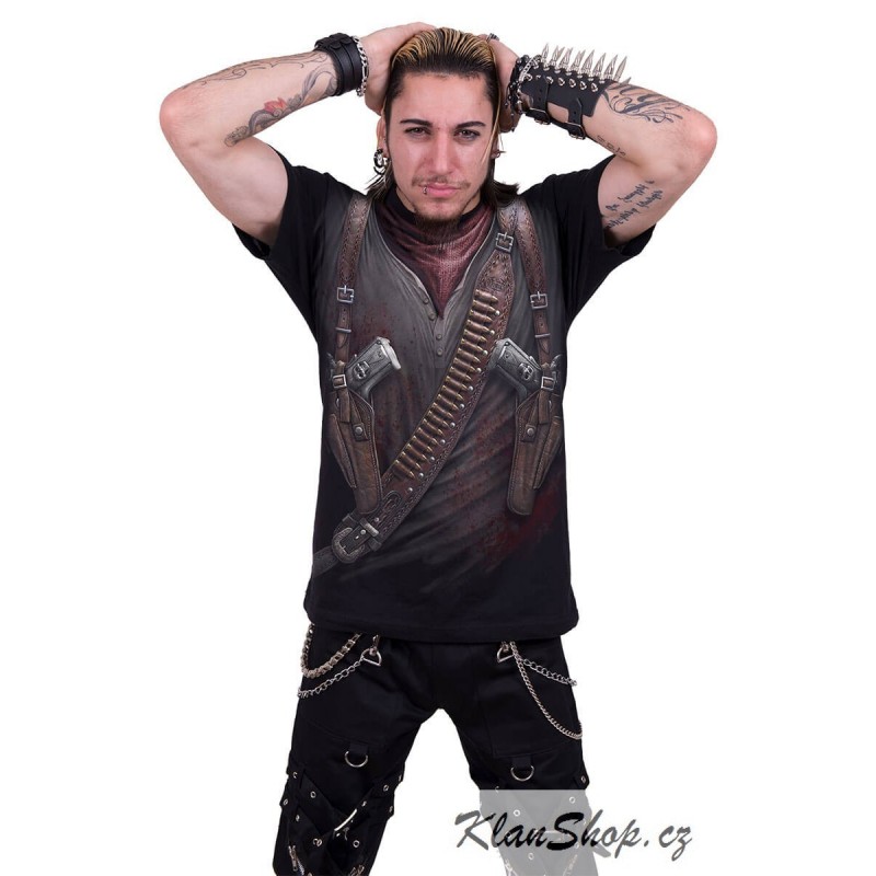 Pánské černé tričko s krátkým rukávem a potiskem, pásy s pistolemi, nábojemi a dýkou.