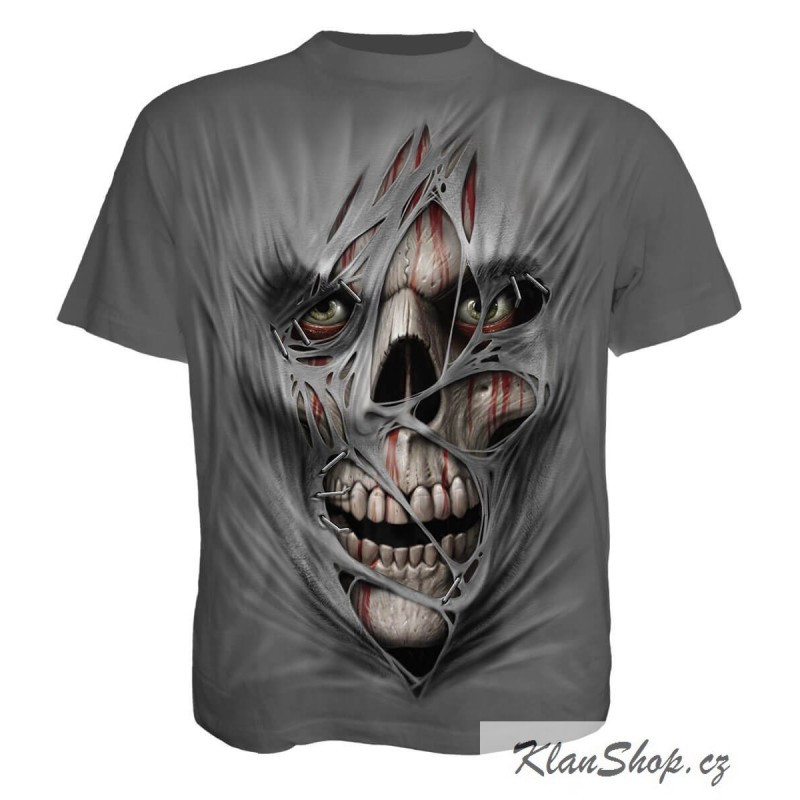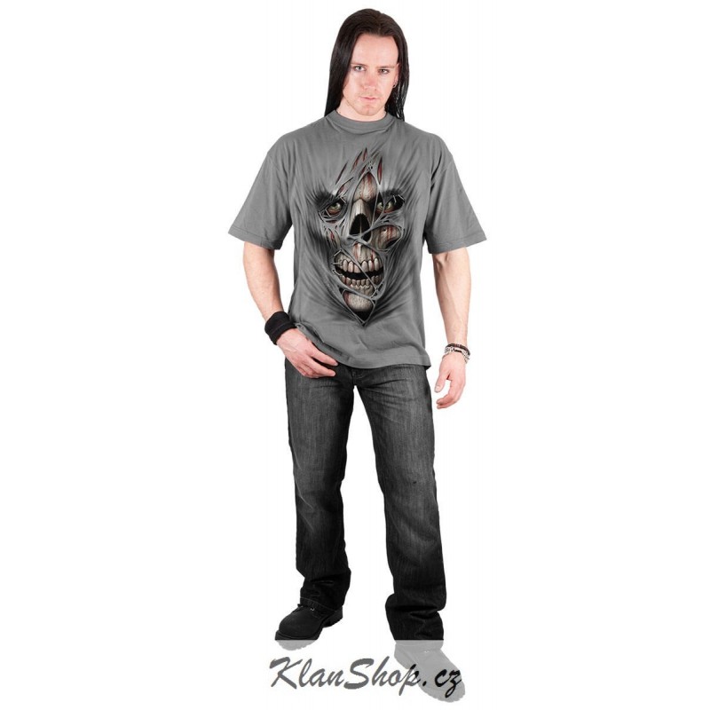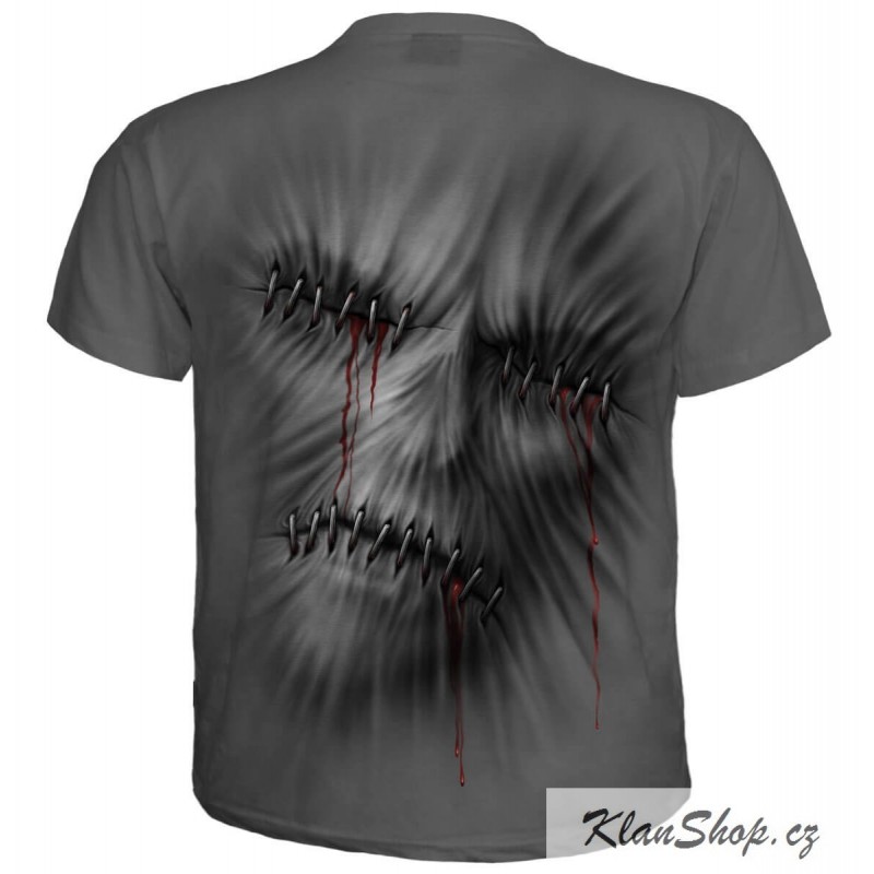 Pánské šedivé tričko s krátkým rukávem a potiskem, stehy, sešitá lebka.