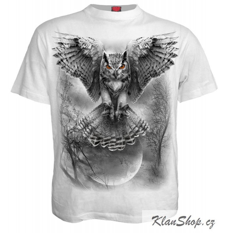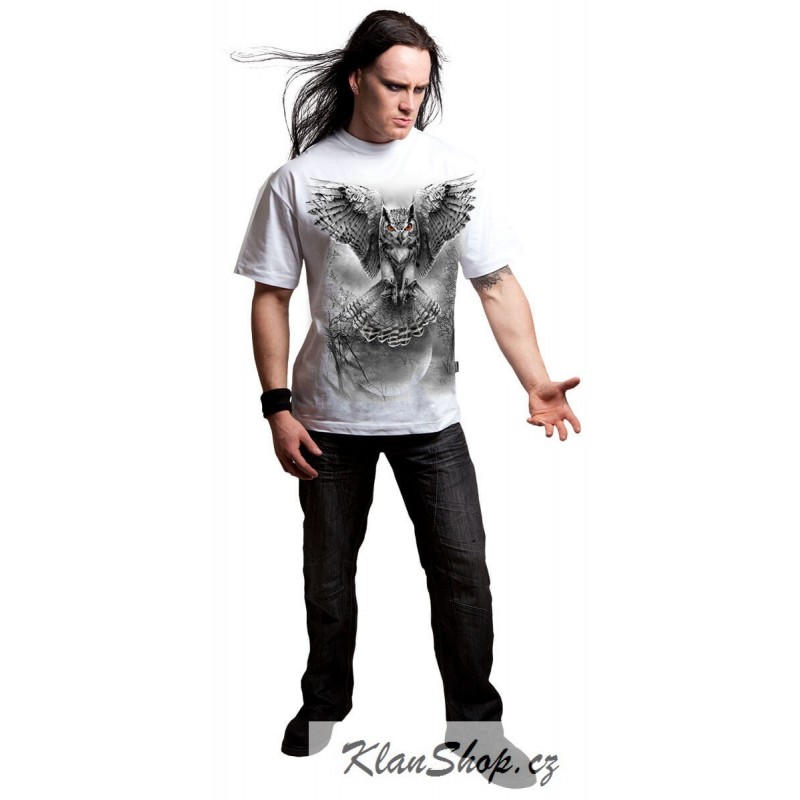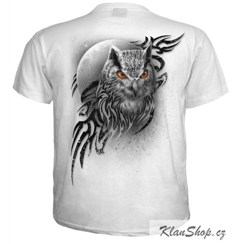 Pánské bílé tričko s krátkým rukávem s potiskem, velký výr (sova), tribal vzor s měsícem.