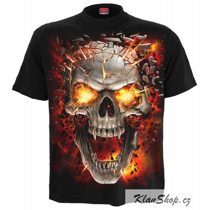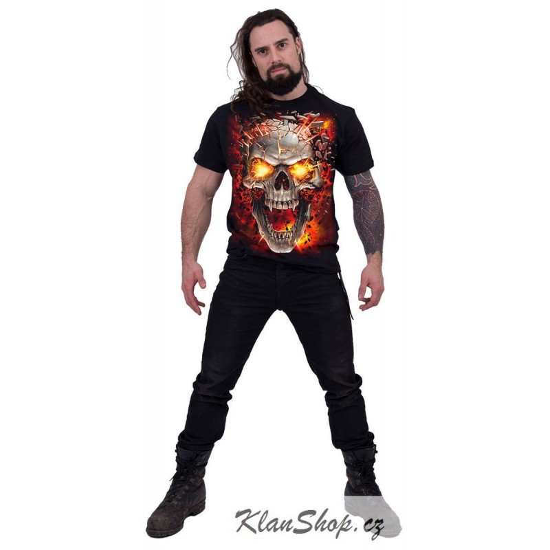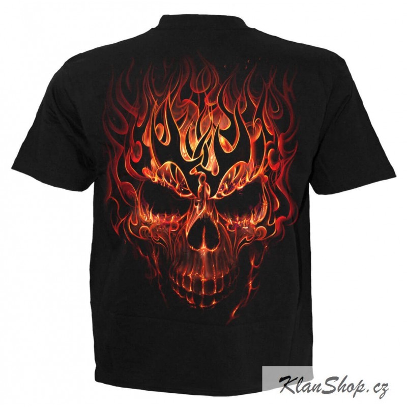Pánské černé tričko s krátkým rukávem s potiskem - tribal lebka v plamenech, rozdrcená lebka v plamenech.
